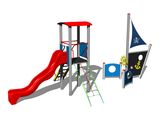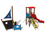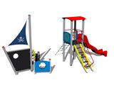 Turm, Rutsche, gewölbtes Dach, Steilaufstieg mit Metallhaltegriffen, Barriere, Steilkletternetz, Mast mit Fahne, 2x Barriere Bullauge, Zeichentafel, Anker, Ruder. Mehr Informationen