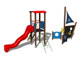 Turm, Rutsche, gewölbtes Dach, Steilaufstieg mit Metallhaltegriffen, Barriere, Steilkletternetz, Mast mit Fahne, 2x Barriere Bullauge, Zeichentafel, Anker, Ruder. Mehr Informationen
