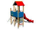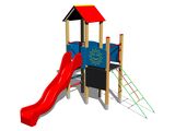 2x Turm, Rutsche, Dach in "A" form, 4x Barriere aus HDPE, Steilkletternetz, Rechentafel, Zeichentafel. Mehr Informationen