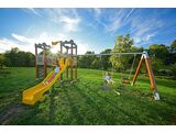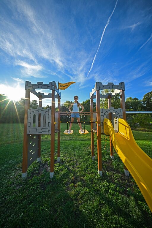 Sitz- und Schwenkgelenke sind nicht Teil der Schaukel. Es ist notwendig, einen Sitzplatz (2 Stück) nach Wahl und Drehgelenke (4 Stück) zu kaufen. 2x Turm, Rutsche, 3x Barriereaus HDPE, Steilkletternetz, Senkrechte Kletterwand am Turm mit Trittstufen, Fahne, 2x Zinnen aus HDPE, Seilbrücke mit Stufen, Metallbalken. Mehr Informationen