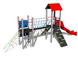 2x Turm, Dach in "A" form, Rutsche, Barriere, Steilaufstieg mit Metallhaltegriffen, Steilaufstieg mit Seil, Brücke mit Seilgeländern, Reckstangenaufstieg mit Haltegriffen, Steilkletternetz, Zeichentafel. Mehr Informationen
