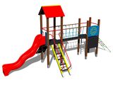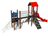 2x Turm, Dach in "A" form, Rutsche, Barriere, Steilaufstieg mit Metallhaltegriffen, Steilaufstieg mit Seil, Brücke mit Seilgeländern, Reckstangenaufstieg mit Haltegriffen, Steilkletternetz, Zeichentafel. Mehr Informationen