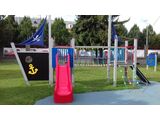 2x Turm, Rutsche, Metallsperre im Metallrahmen, 2x Mast mit Fahne, Steilaufstieg mit Seil, Seilbrücke, Steilkletternetz, Zeichentafel, Anker, Ruder, 2x Barriere aus HDPE. Mehr Informationen