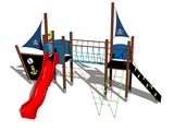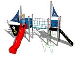 2x Turm, Rutsche, Metallsperre im Metallrahmen, 2x Mast mit Fahne, Steilaufstieg mit Seil, Seilbrücke, Steilkletternetz, Zeichentafel, Anker, Ruder, 2x Barriere aus HDPE. Mehr Informationen