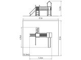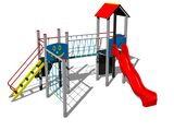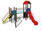 2x Turm, Rutsche, Dach in "A" form, Steilaufstieg mit Metallhaltegriffen, Steilkletterwand am Turm, Steilaufstieg mit Seil, Seilbrücke, Steilkletternetz, 2x Barriereaus HDPE. Mehr Informationen