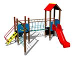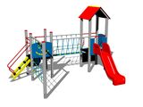 2x Turm, Rutsche, Dach in "A" form, Steilaufstieg mit Metallhaltegriffen, Steilkletterwand am Turm, Steilaufstieg mit Seil, Seilbrücke, Steilkletternetz, 2x Barriereaus HDPE. Mehr Informationen