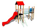 Rutsche aus Fiberglas. Die Stirnseite der Rutsche, Trittbretter usw. sind aus hochwertigem HDPE-Kunststoff (farbiger Hochdruck-Polyethylen, der sich durch hohe Farbstabilität, UV-Beständigkeit und vor allem Sicherheit auszeichnet, weil er nicht zerbrechlich ist, so dass keine Verletzungsgefahr für Kinder durch scharfe Bruchstücke besteht) hergestellt. Die Seilbrücke und das Seil werden aus dem Material HERCULES (16 mm Seil aus Polypropylen mit einem inneren Stahlkern) hergestellt und sind mit Kunststoff- oder Aluminium-Gelenken verbunden. Das Podest und der schräge Aufstieg bestehen aus HPL (Hochdruck Laminat, das sich durch hohe Farbstabilität, Kratzfestigkeit und Wasserbeständigkeit). Die Handgriffe Das Dach bestehen aus HPL (Hochdruck Laminat, das sich durch hohe Farbstabilität, Kratzfestigkeit, UV-Beständigkeit und Wasserbeständigkeit). Das gesamte Verbindungsmaterial ist verzinkt oder aus Edelstahl.