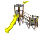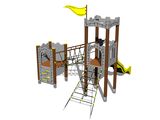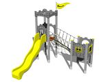 2x Turm, Rutsche, 3x Barriereaus HDPE, Steilkletternetz, Seilbrücke, Senkrechte Kletterwand am Turm mit Trittstufen, Fahne, Zinnen aus HDPE. Mehr Informationen