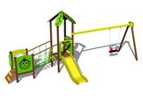 2x Turm, Rutsche, Dach in Blattform, 2x Barriereaus HDPE, Seilbrücke, Schauloch, Schrägrampe mit Stufen und HDPE-Griffen, Schrägrampe mit HDPE-Stufen, Sitz BABY. Mehr Informationen