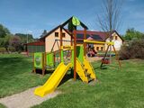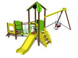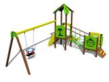 2x Turm, Rutsche, Dach in Blattform, 2x Barriereaus HDPE, Seilbrücke, Schauloch, Schrägrampe mit Stufen und HDPE-Griffen, Schrägrampe mit HDPE-Stufen, Sitz BABY. Mehr Informationen