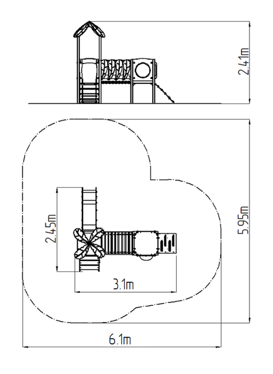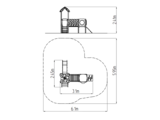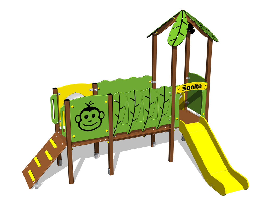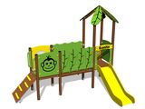 2x Turm, Rutsche, Dach in Blattform, 2x Barriereaus HDPE, Brücke mit Kunststoffgeländer, Schauloch, Schrägrampe mit Stufen und HDPE-Griffen, Schrägrampe mit HDPE-Stufen. Mehr Informationen
