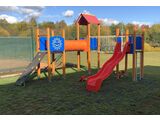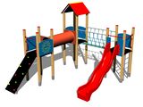 3x Turm, Rutsche, Dach in "A" form, 5x Barriereaus HDPE, Reckstangenaufstieg mit Haltegriffen, Steilkletterwand mit Handgriffen, Seilbrücke, Kriechtunnel zwischen Türmen. Mehr Informationen