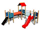 3x Turm, Rutsche, Dach in "A" form, 5x Barriereaus HDPE, Reckstangenaufstieg mit Haltegriffen, Steilkletterwand mit Handgriffen, Seilbrücke, Kriechtunnel zwischen Türmen. Mehr Informationen
