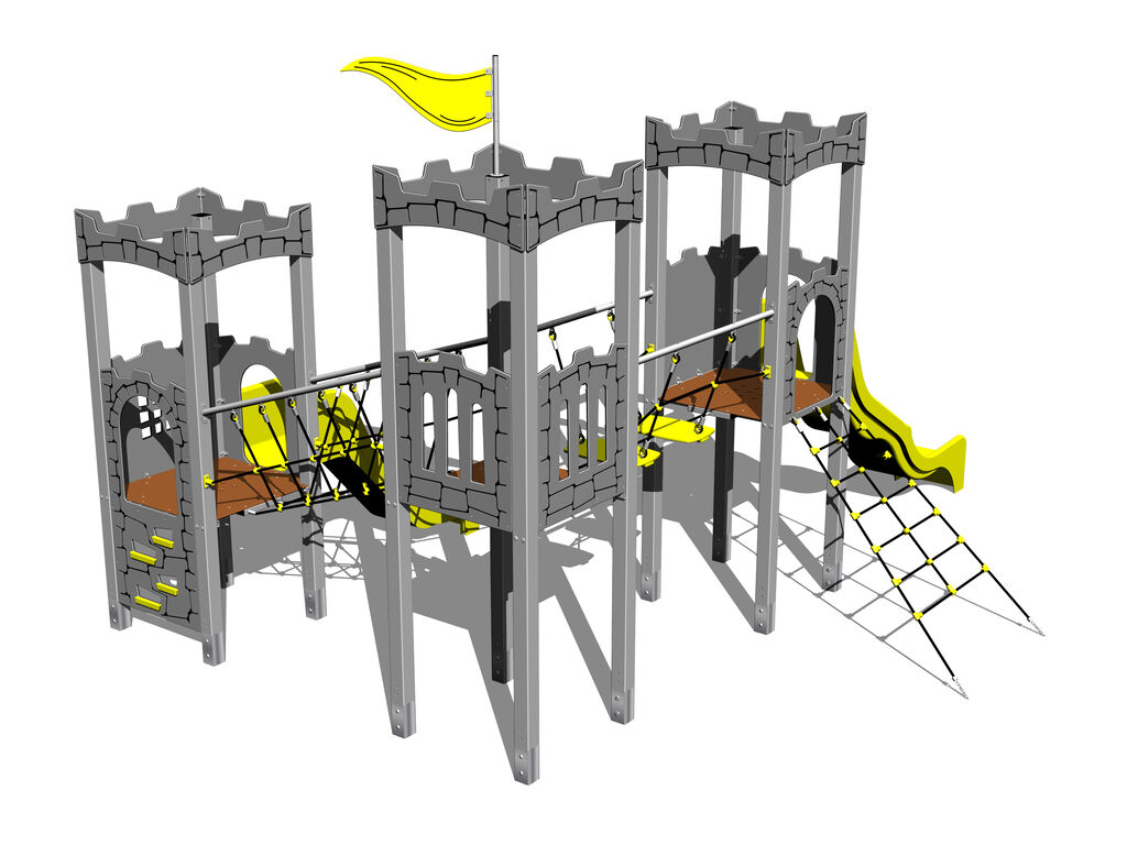 3x Turm, 2x Rutsche, 4x Barriereaus HDPE, Steilkletternetz, Seilbrücke, Senkrechte Kletterwand am Turm mit Trittstufen, Fahne, 3x Zinnen aus HDPE, Seilbrücke mit Stufen. Mehr Informationen