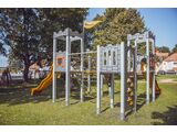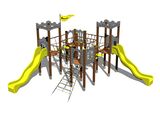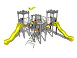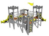 4x Turm, 2x Rutsche, 4x Barriereaus HDPE, Steilkletternetz, 2x Seilbrücke, Senkrechte Kletterwand am Turm mit Trittstufen, Fahne, 2x Zinnen aus HDPE, 2x Seilbrücke mit Stufen. Mehr Informationen