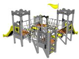 4x Turm, 2x Rutsche, 4x Barriereaus HDPE, Steilkletternetz, 2x Seilbrücke, Senkrechte Kletterwand am Turm mit Trittstufen, Fahne, 2x Zinnen aus HDPE, 2x Seilbrücke mit Stufen. Mehr Informationen