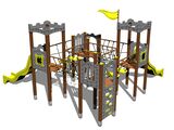 4x Turm, 2x Rutsche, 4x Barriereaus HDPE, Steilkletternetz, 2x Seilbrücke, Senkrechte Kletterwand am Turm mit Trittstufen, Fahne, 2x Zinnen aus HDPE, 2x Seilbrücke mit Stufen. Mehr Informationen