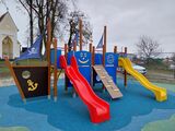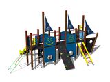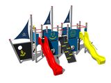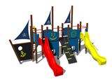 5x Turm, 2x Rutsche, Metallsperre im Holzrahmen, 3x Mast mit Fahne, Zeichentafel, Steilaufstieg mit Seil, Steilkletternetz, Steilkletterwand mit Handgriffen, Leiteraufstieg mit Metallsprossen, Reckstangenaufstieg mit Haltegriffen, 4x Bullauge, Anker, Ruder aus HDPE, 4x Barriereaus HDPE. Mehr Informationen
