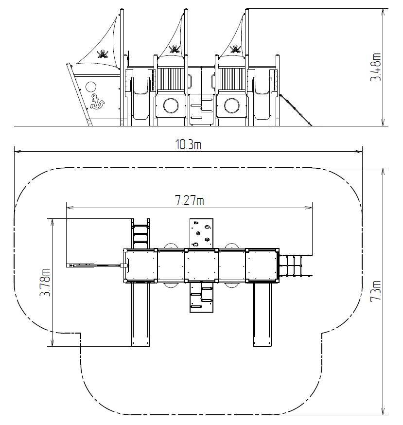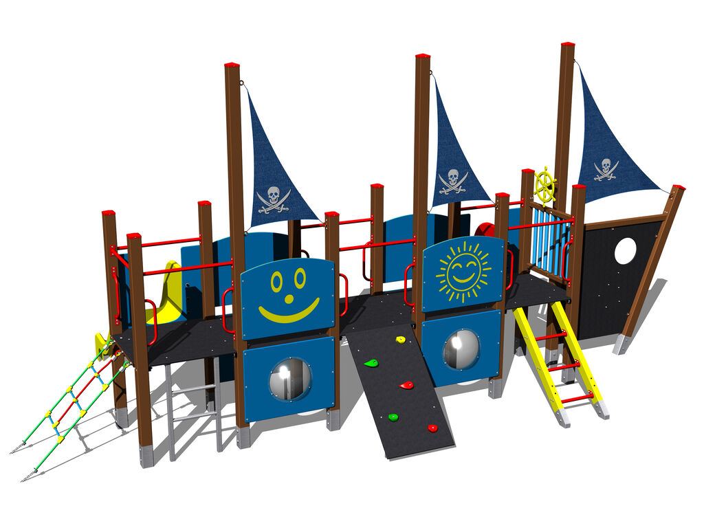 5x Turm, 2x Rutsche, Metallsperre im Holzrahmen, 3x Mast mit Fahne, Zeichentafel, Steilaufstieg mit Seil, Steilkletternetz, Steilkletterwand mit Handgriffen, Leiteraufstieg mit Metallsprossen, Reckstangenaufstieg mit Haltegriffen, 4x Bullauge, Anker, Ruder aus HDPE, 4x Barriereaus HDPE. Mehr Informationen
