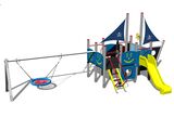 6x Turm, 2x Rutsche, Steilaufstieg mit Metallhaltegriffen, Zeichentafel, 2x Mast mit Fahne, Ruder, Anker, Kettenschaukel, 2x Barriere Bullauge, 4x Barriere aus HDPE, 2x Metallsperre im Holzrahmen, Steilkletternetz. Mehr Informationen