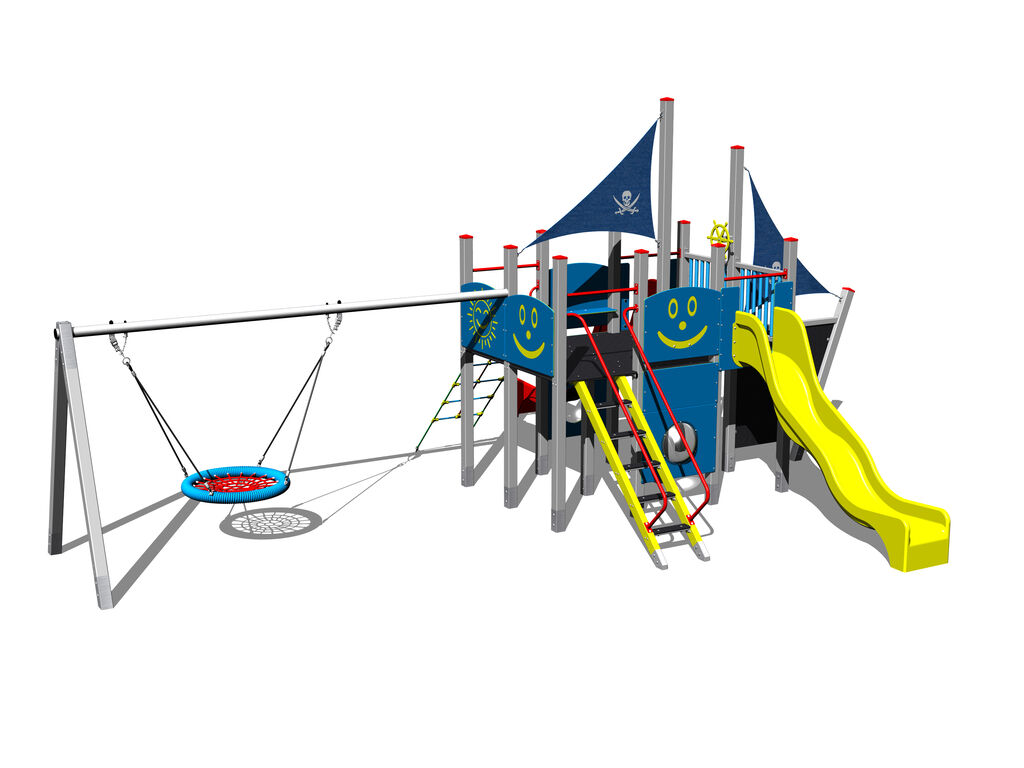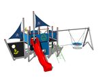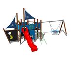 6x Turm, 2x Rutsche, Steilaufstieg mit Metallhaltegriffen, Zeichentafel, 2x Mast mit Fahne, Ruder, Anker, Kettenschaukel, 2x Barriere Bullauge, 4x Barriere aus HDPE, 2x Metallsperre im Holzrahmen, Steilkletternetz. Mehr Informationen