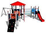 Rutsche aus Fiberglas. Die Stirnseite der Rutsche, Trittbretter usw. sind aus hochwertigem HDPE-Kunststoff (farbiger Hochdruck-Polyethylen, der sich durch hohe Farbstabilität, UV-Beständigkeit und vor allem Sicherheit auszeichnet, weil er nicht zerbrechlich ist, so dass keine Verletzungsgefahr für Kinder durch scharfe Bruchstücke besteht) hergestellt. Die Seilbrücke wird aus dem Material HERCULES (16 mm Seil aus Polypropylen mit einem inneren Stahlkern) hergestellt und ist mit Kunststoff- oder Aluminium-Gelenken verbunden. Das Podest und die schräge Kletterwand bestehen aus HPL (Hochdruck Laminat, das sich durch hohe Farbstabilität, Kratzfestigkeit und Wasserbeständigkeit). Die Handgriffe Die Klettergriffe bestehen aus Quarzsand und Epoxidharz, was Haltbarkeit und Farbechtheit gewährleistet und die Oberflächen sanft zur Haut macht. Das gesamte Verbindungsmaterial ist verzinkt oder aus Edelstahl.